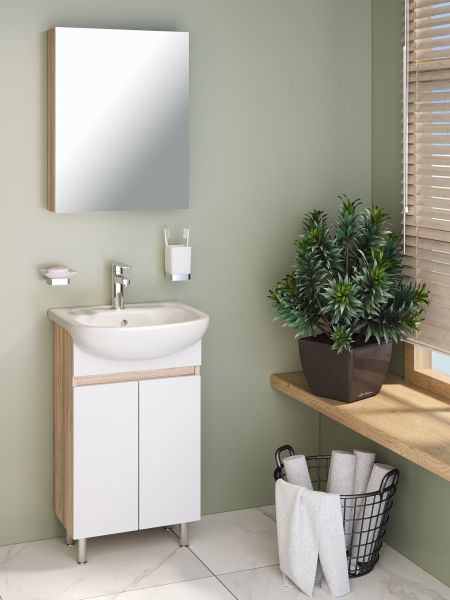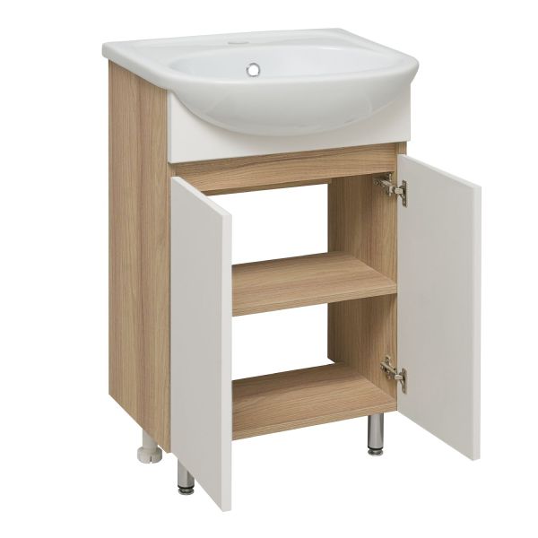Тумба под раковину RUNO ЛАДА - модное и оригинальное решение для бюджетного оснащения ванной комнаты. Тумба выполнена в цвете - блэквуд/белый. Тумба в ванную комнату имеет две распашные дверцы и одну внутреннюю полку. В комплекте идут петли со встроенным доводчиком, 2 хромированные и 2 пластиковые ножки. К тумбе для ванной комнаты ЛАДА подходит керамическая раковина "Уют" (510*415 мм). Раковина имеет глубину 14 см. Мебель для ванной RUNO - красота и практичность в мелочах!