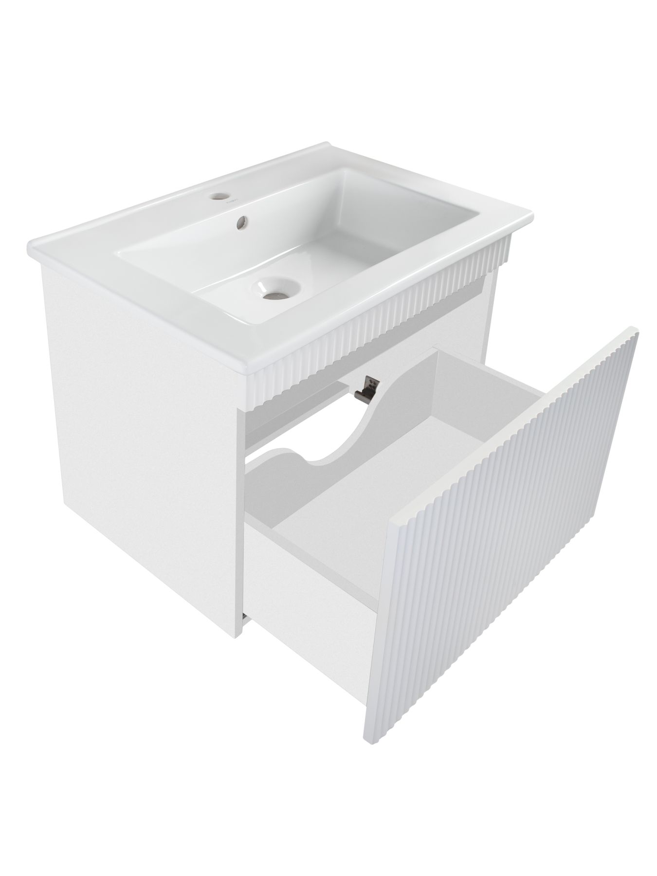 Тумба под раковину МОДЕНА (подвесная) – это изысканность и утончённая роскошь в интерьере. Волнистые рифленые фасады визуально «оживляют» и «приводят в движение» всю обстановку комнаты, сохраняя при этом умиротворение и покой, превосходно сочетаются с классическим белым цветом корпуса. Цвет фасада также классический – белый глянец, идеально впишется в любой интерьер ванной комнаты. Тумба для ванной оснащена выдвижным ящиком на шариковых направляющих, к тумбе для ванной подходит накладная керамическая раковина «Оскар» (660х470 мм). Раковина глубиной 19 см. Мебель для ванной RUNO - красота и практичность в мелочах, тумба под раковину для ванной комнаты Модена – лучший выбор для Вашей ванной комнаты!