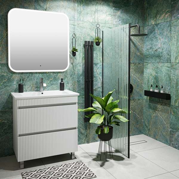 Тумба под раковину МОДЕНА (напольная) – это изысканность и утончённая роскошь в интерьере. Волнистые рифленые фасады визуально «оживляют» и «приводят в движение» всю обстановку комнаты, сохраняя при этом умиротворение и покой, превосходно сочетаются с классическим белым цветом корпуса. Цвет фасада также классический – белый глянец, идеально впишется в любой интерьер ванной комнаты. Тумба для ванной оснащена двумя выдвижными ящиками на шариковых направляющих, к тумбе для ванной подходит накладная керамическая раковина «Оскар» (770х470 мм). Раковина глубиной 19 см. Мебель для ванной RUNO - красота и практичность в мелочах, тумба под раковину для ванной комнаты Модена – лучший выбор для Вашей ванной комнаты!