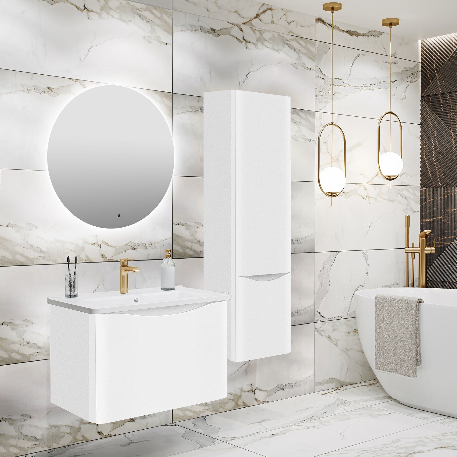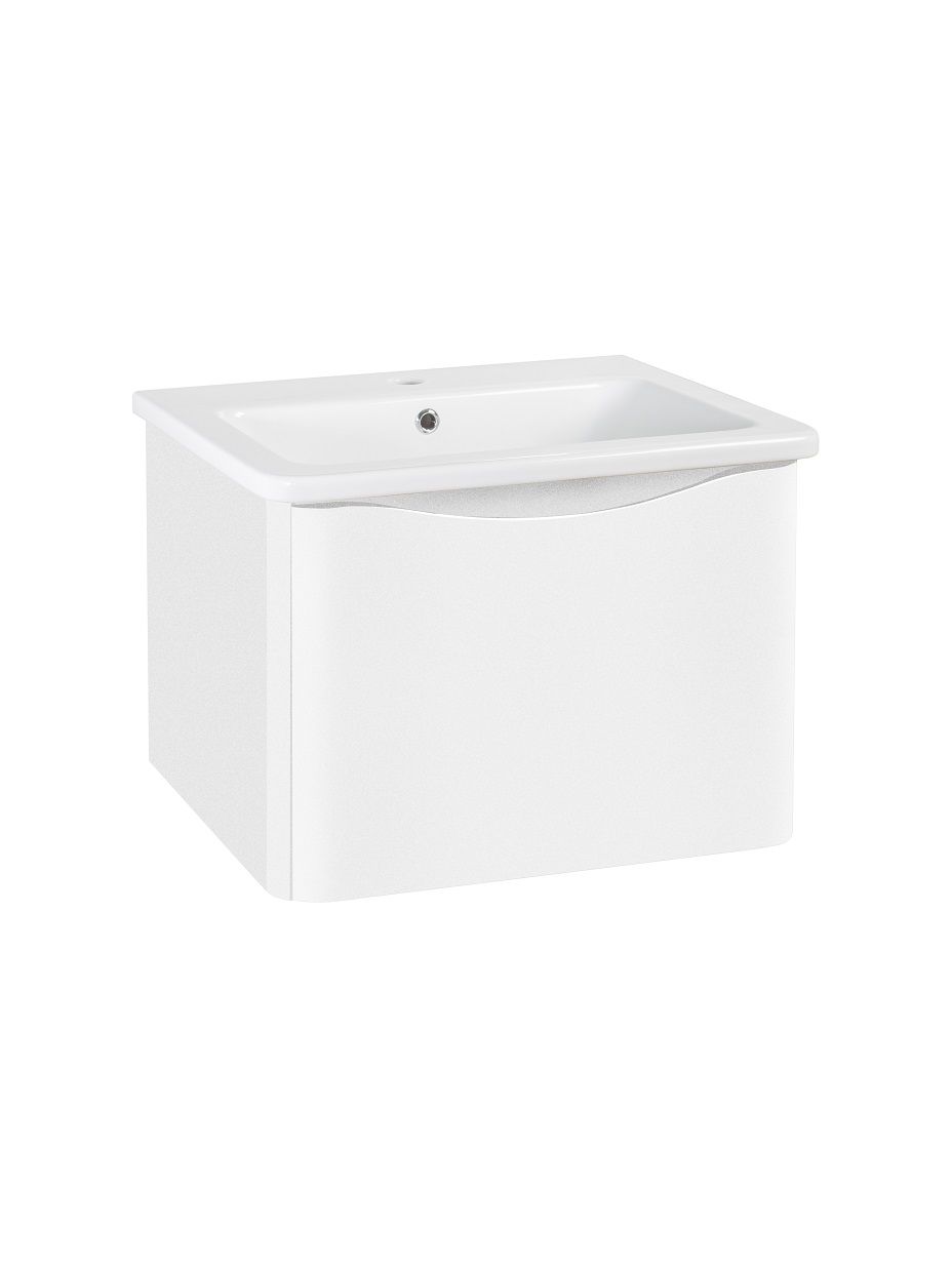 Тумба с раковиной в ванную Runo Тоскана (подвесная) - выполнена в ультрасовременном дизайне в классическом белом цвете. Тумба под раковину отличается изысканным дизайном, скруглённые углы тумбы, древесная текстура фасада, врезная ручка – придают мебели необычный и незабываемый внешний вид. Тумба в ванную оснащена выдвижным ящиком на шариковых направляющих, с системой плавного закрывания. Тумба под раковину ТОСКАНА гармонично впишется в любой интерьер ванной комнаты. Тумба для ванной комплектуется накладным керамическим умывальником Никсон 60 (600х460 мм) ТМ Dreja, необычный дизайн которого сочетание строгих линий прямоугольника со скруглёнными углами, отражают современные тренды в дизайне. Раковина глубиной 16 см. Мебель для ванной комнаты RUNO - красота и практичность в мелочах!
