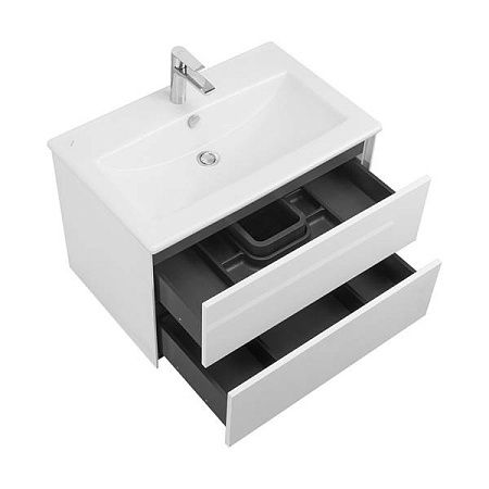 Тумба с раковиной Акватон Сохо 75 1A2581K2AJ010 75 смТумба Сохо 75 функционально состоит из двух вместительных ящиков, оснащенных системой push to open, обеспечивающей надежное, комфортное и бесшумное закрывание. Фасады изделия выполнены из МДФ в белой глянцевой покраске, корпус из ламинированной влагостойкой ДСП в покраске белый глянец. Верхний и нижний ящики оснащены системой организации пространства, которая позволяет содержать косметические средства в идеальном порядке. Дополняет тумбу стильная раковина Элина от бренда Santek с удобной чашей. Все внутренние детали тумбы выполнены в цвете антрацит.