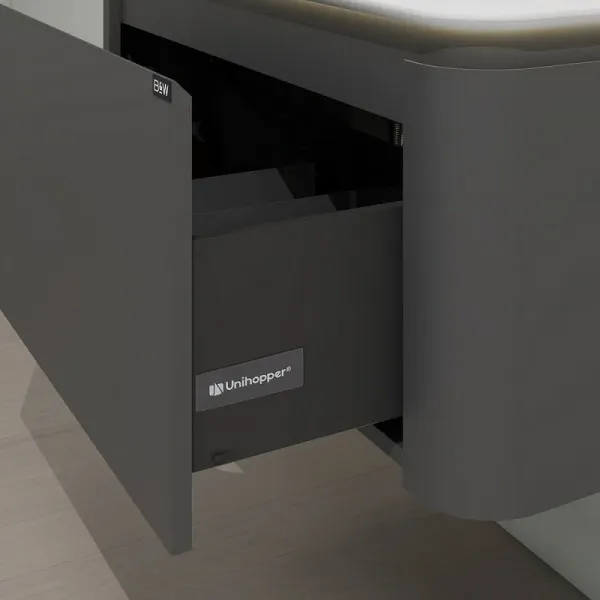 Тумба с раковиной для ванной комнаты датского производителя Black&White. Данная версия является продолжением линейки U 935 в сером цвете. Раковина — столешница изготовлена из не пористого искусственного камня Corian, который тактильно ощущается как soft touch материал, он легок и прост в уборке,а слив оборудован донным клапаном хромированного цвета. База производится из влагостойкой девятислойной фанеры и покрыта эмалью для долгосрочного сохранения материала.Важной особенностью является контурная диодная подсветка, которая расположена по периметру столешницы.На тумбе предусмотрен один выдвижной ящик, оборудованный фурнитурой UniHopper с доводчиками.Коллекция U 935– эргономичный и продуманный продукт,который наполнит Вашу ванную комнату уютом, а плавные и утонченные формы впишутся в любые современные интерьеры.
