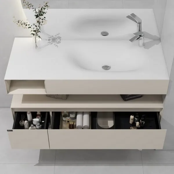Левосторонняя модульная мебель для ванной комнаты от датского производителя Black&White в габаритных размерах 120x52x35 см.Угловая концепция со смещенной раковиной – столешницей из не пористого искусственного камня на основе природных минералов Corian– позволяет комфортно разместить косметические принадлежности рядом с чашей, также слив комплектуется донным клапаном в цвете хром.  База как и модуль под раковиной изготовлен из девятислойной влагостойкой фанеры и окрашена эмалью для насыщенного цвета и лучшей изоляции от влаги основания изделия. Для хранения предусмотрены два выдвижных ящика на фурнитуре компании UniHoppr с доводчиками и открытая ниша в модуле под раковиной.U 955– продукт инновационных решений и функционала от датских дизайнеров, который наполнит Вашу ванную комнату уютом и скандинавским стилем.