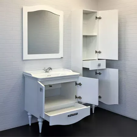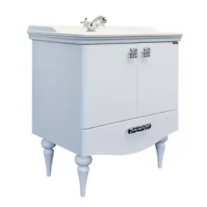 Тумба с раковиной Comforty Монако 00004136578 80 см белыйНапольная тумба-умывальник в неоклассическом стиле с двумя створками и нижним широким ящиком. Створки оснащены петлями с плавным закрыванием. Фасады тумбы покрыты белой глянцевой эмалью. Тумба укомплектована широкой и глубокой раковиной в классическом стиле с бортиком по периметру.