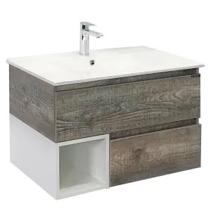 Тумба с раковиной Comforty Турин 00-00013913 75 см дуб бежевыйХарактеристики: Тумба: Цвет: дуб бежевый, белый глянцевый. Материал тумбы: влагостойкий ЛДСП. Организация хранения: два ящика, открытая полка. Ящики оборудованы системой плавного закрывания. Монтаж: подвесной. Раковина: Цвет: белый. Материал: санфарфор. Форма: прямоугольная. Одно отверстие под смеситель. Отверстие под перелив. В комплекте поставки: тумба, раковина Comforty 75E, крепежный комплект