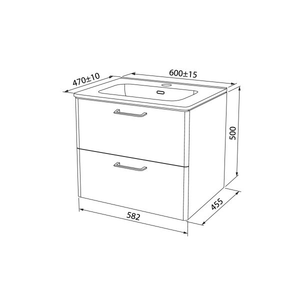 Тумба с умывальником для ванной комнаты, подвесная. Размеры тумбы без умывальника: 467х602х500 мм (ДхШхВ). Размеры умывальника: 460х600 мм (ДхШ). Фасад МДФ 19 мм в эмали (белый глянец). Корпус влагостойкий ВЛДСП 16 мм в эмали. Ручки - цвет состаренное олово. Два выдвижных ящика с механизмом плавного доведения. Пластиковый ограничитель под сифон в верхнем ящике. Перекатной организатор в нижнем ящике. Навесы усиленные с планкой. Упаковка: картон, пленка, пенопластовые уголки.