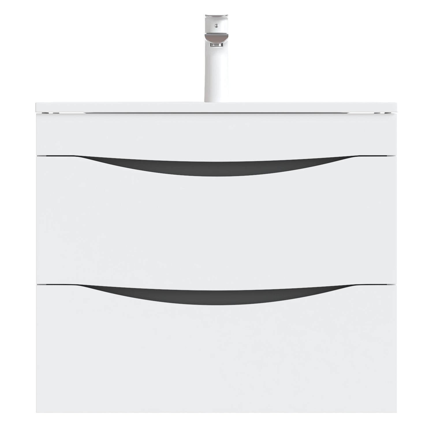 Тумба с умывальником для ванной комнаты, подвесная. Размеры тумбы без умывальника: 455х603х500 мм (ДхШхВ). Размеры умывальника: 465х600х175 мм (ДхШхВ). Фасад МДФ 19 мм в эмали (белая), фрезеровка. Корпус влагостойкий ЛДСП 16 мм в эмали. Интегрированные ручки. Два выдвижных ящика с механизмом плавного доведения. Пластиковый ограничитель под сифон в верхнем ящике. Перекатной организатор в нижнем ящике. Навесы усиленные с планкой. Упаковка: картон, пленка, пенопластовые уголки.