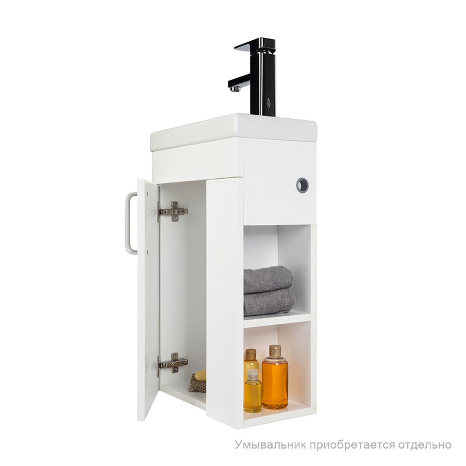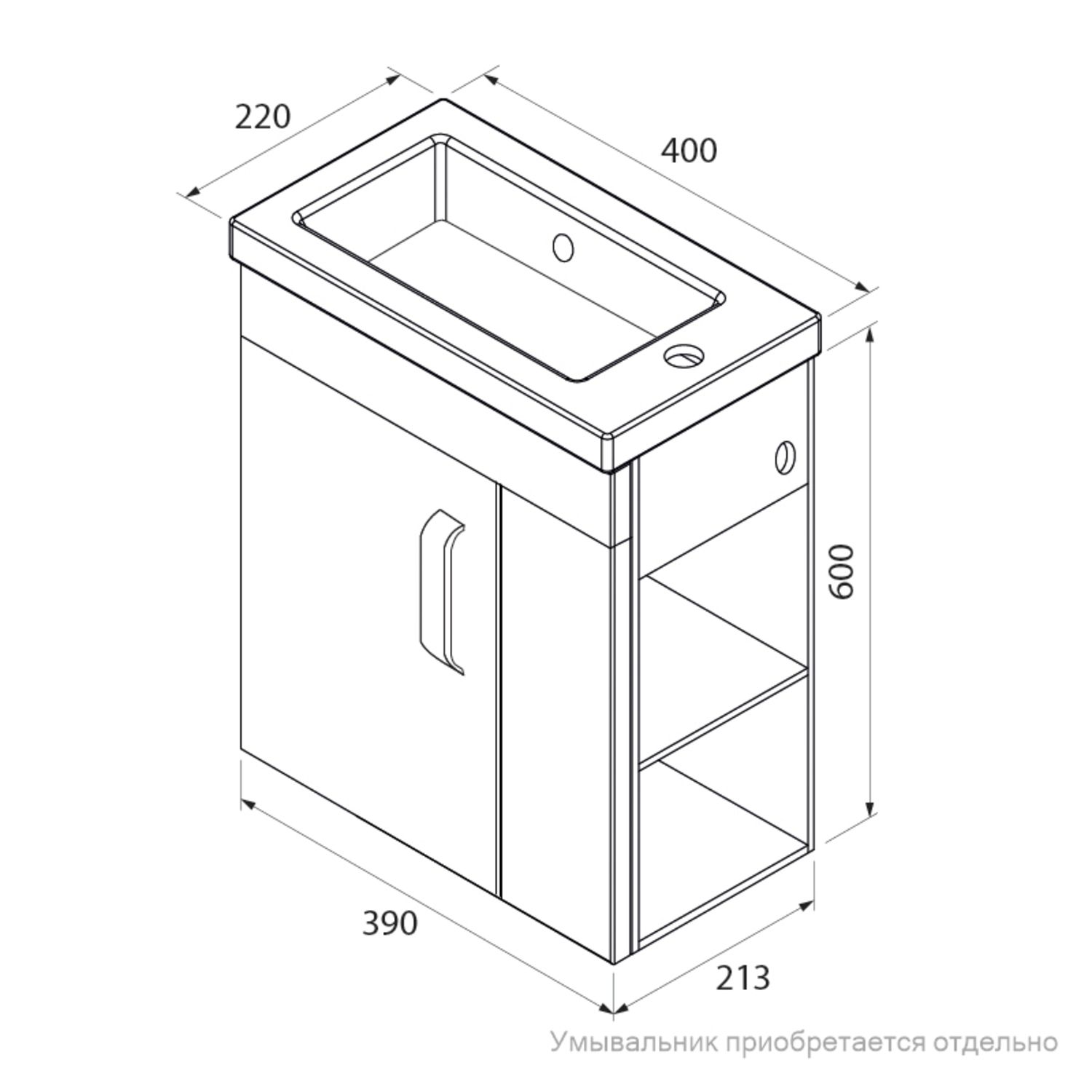 Тумба с умывальником для ванной комнаты, подвесная. Размеры тумбы без умывальника: 213х390х600 мм (ДхШхВ). Размеры умывальника: 220х400 мм (ДхШ). Фасад ЛДСП 16 мм в эмали, боковины ЛДСП белый глянец. Одна распашная дверца, фальш-фасад, 2 открытые полки с правой стороны. Сбоку тумбы - отверстие для гигиенического душа с пластиковым кольцом. Петли с доводчиком. Упаковка: картон, пленка, пенопластовые уголки.