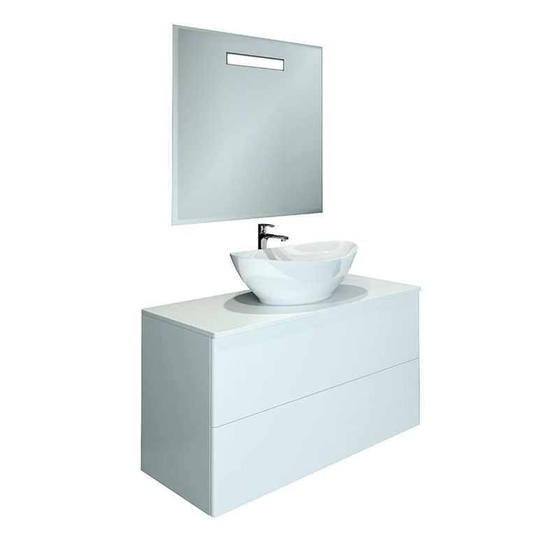 Подвесная тумба с раковиной-чашей и столешницей МДФ, с двумя выдвижными ящиками. Предназначена для использования в ванных комнатах с повышенной влажностью. Система Push to Open: ящики открываются нажатием на них. Высокое качество сборки, материалов и фурнитуры. Столешница, корпус и фасад: МДФ, плёнка ПВХ белая глянцевая. Раковина накладная (глубина 10 см) - фаянс.
