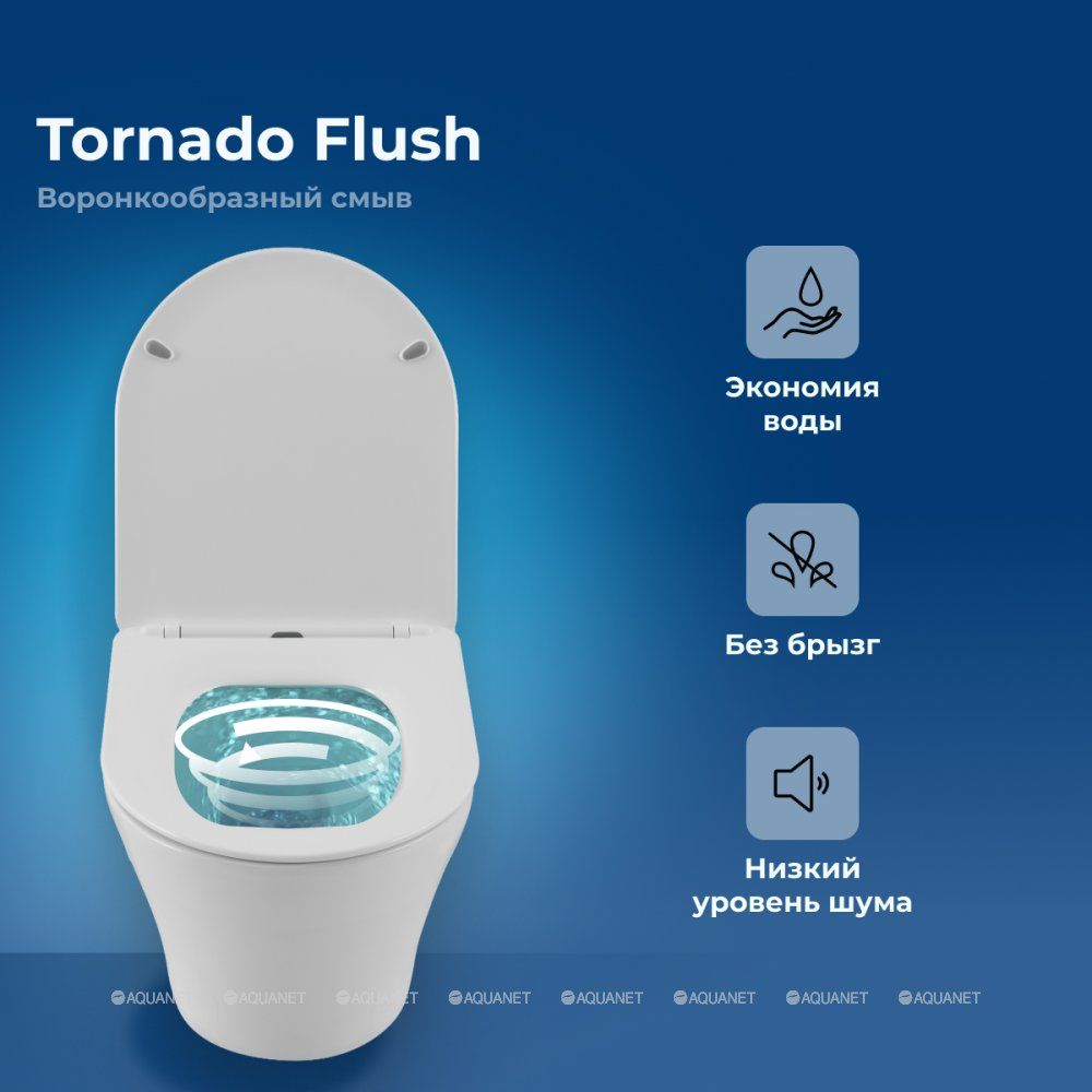 - Tornado Flush современный воронкообразный вид смыва, который позволяет обработать до 95% поверхности чаши унитаза. система смыва Tornado Flush работает по принципу: струи воды из отверстий в чаше создают эффект водоворота, что позволяет полностью очищать всю внутреннюю поверхность унитаза. унитаз с системой Tornado Flush обладает массой преимуществ, таких как: