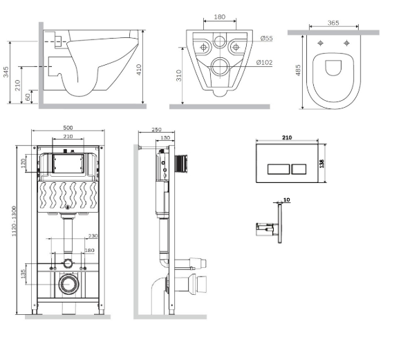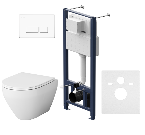 Полностью готовый к установке комплект: система инсталляции с клавишей, подвесной унитаз сиденьем.Не разборная рама из стального профиля выдерживает нагрузку до