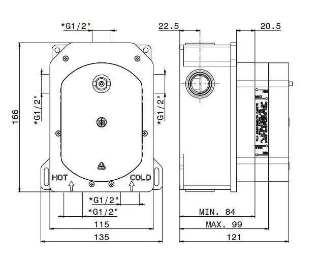 Для работы термостатического смесителя холодная вода должна быть подведена с правой стороны.