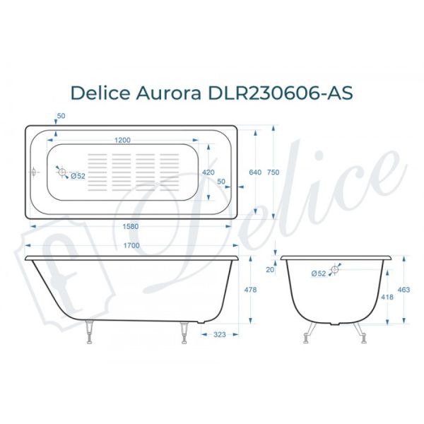 Ванна чугунная Delice Aurora DLR230606-AS 170x75 с антискользящим покрытием