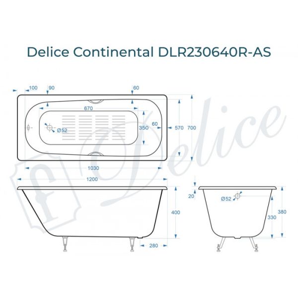 Ванна чугунная Delice Continental DLR230640R-AS 120х70 с отверстиями под ручки и антискользящим покрытием купить