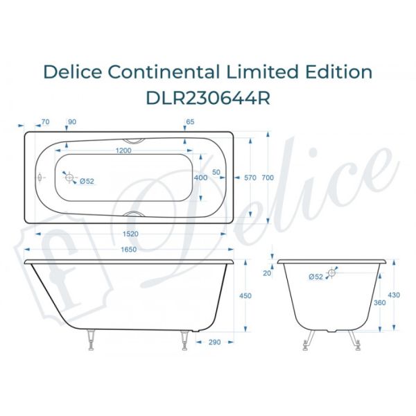 Ванна чугунная Delice Continental Limited Edition DLR230644R-AS 165х70 с отверстиями под ручки и антискользящим покрытием