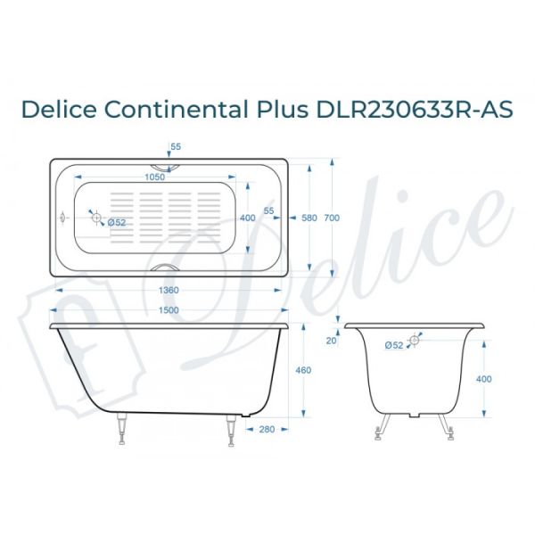 Ванна чугунная Delice Continental PLUS DLR230633R-AS с отверстиями под ручки и антискользящим покрытием 150х70 см