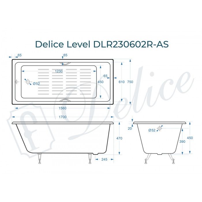 Ванна чугунная Delice Level DLR230602R-AS 170х75 с отверстиями под ручки и антискользящим покрытием купить