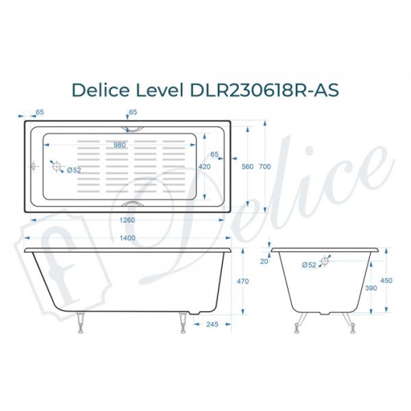 Ванна чугунная Delice Level DLR230618R-AS 140х70 с отверстиями под ручки и антискользящим покрытием купить