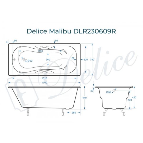 Ванна чугунная Delice Malibu DLR230609R 170x75 с отверстиями под ручки