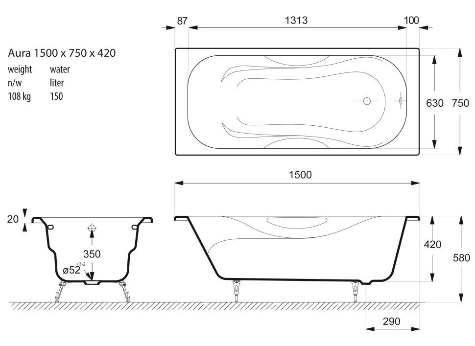Общие характеристикиРазмер 150х75 Длина 150 см Ширина 75 см Глубина 42 см Высота на ножках 57 см Полезный объём 220 л Вес 115 кг Бренд Vinsent Veron 7 слёв титановой эмали класса 1А Цвет эмали белый Без антискользящего покрытия Диаметр слива Ø52 Расположение перелива стандартное