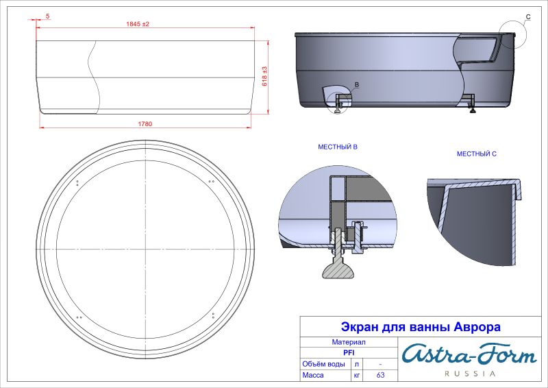 Ванна из искусственного камня Astra-Form Аврора 01010038 185 см белый глянец