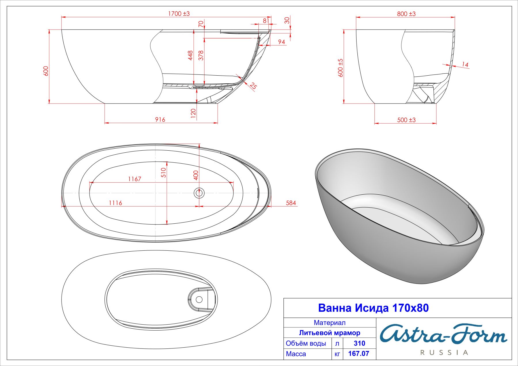 Ванна из искусственного камня Astra-Form Исида 01010049 170x80 см с интегрированным переливом белый глянец