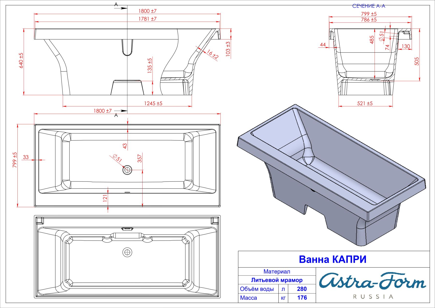Ванна из искусственного камня Astra-Form Капри 01010034 180x80 см белый глянец купить