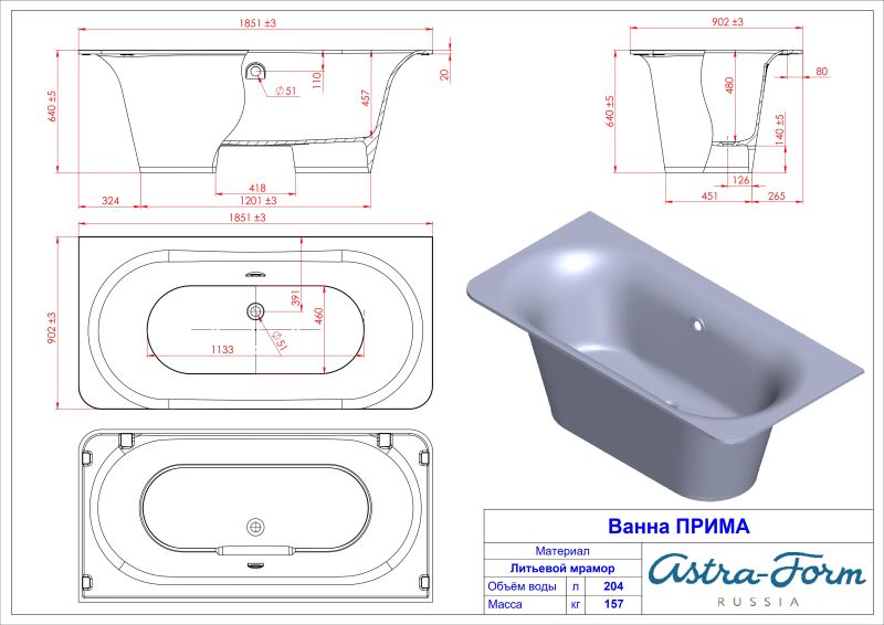 Ванна из искусственного камня Astra-Form Прима 01010037 185x90 см белый глянец