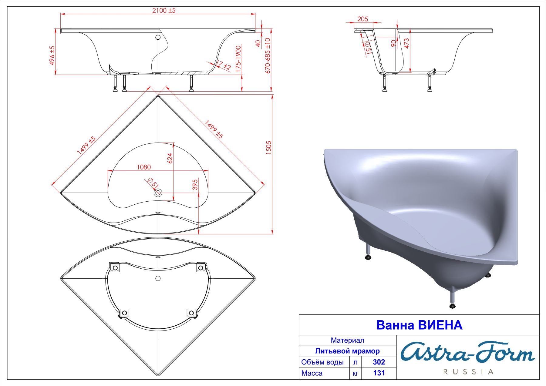Ванна из искусственного камня Astra-Form Виена 01010071 150 см белый матовый