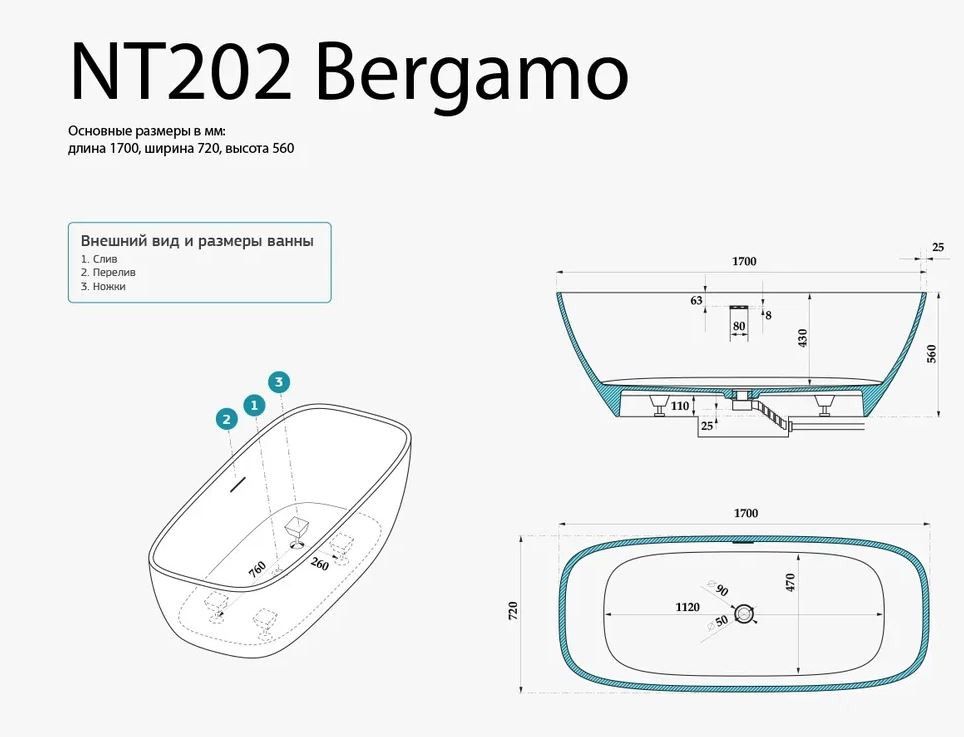 Ванна из искусственного камня NT Bagno Bergamo NT202 170x72см белый матовый