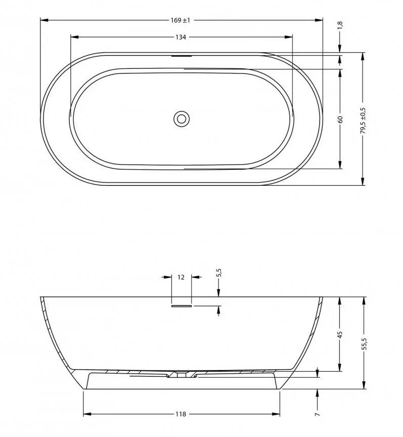 Слив-перелив уже установлен: перелив выполнен в виде удлинённой щели, слив - в виде нажимного клапана Push-Open такого же матового цвета, как и ванна.