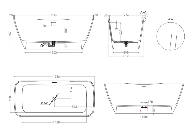 Ванна из искусственного камня Salini Agatha S-Stone 100221MRF 180x80см RAL полностью