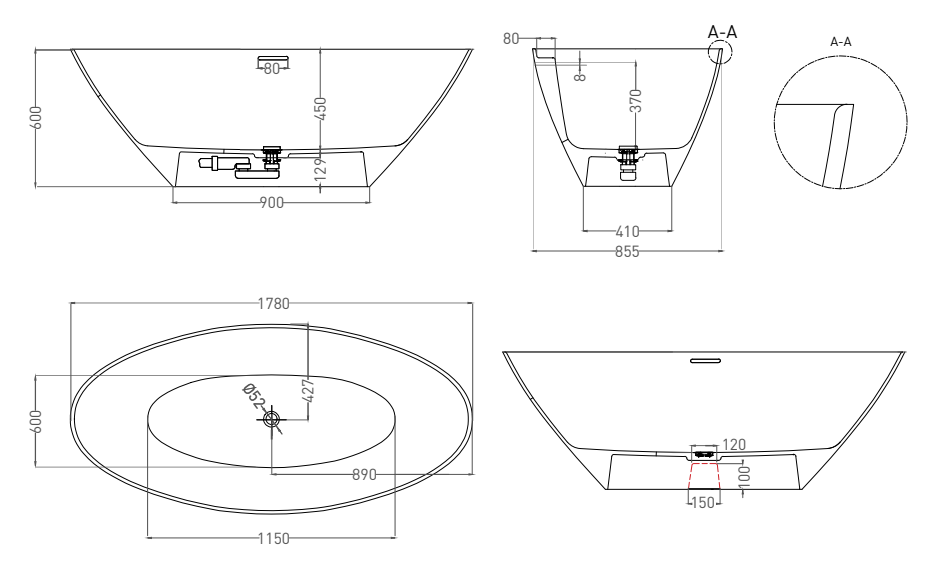 Ванна из искусственного камня Salini Diva S-Sense 102211GRH 178x85см RAL снаружи