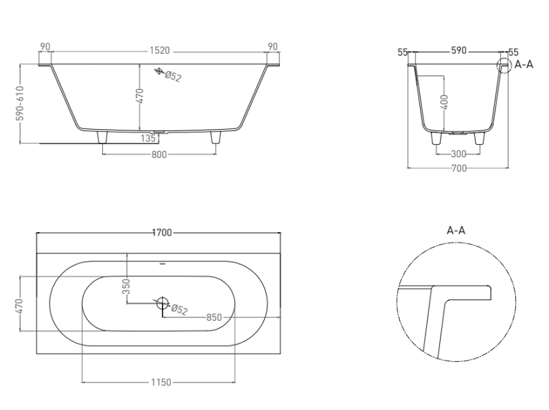 Ванна из искусственного камня Salini Ornella Axis S-Sense 104613GRH 170x70см RAL снаружи