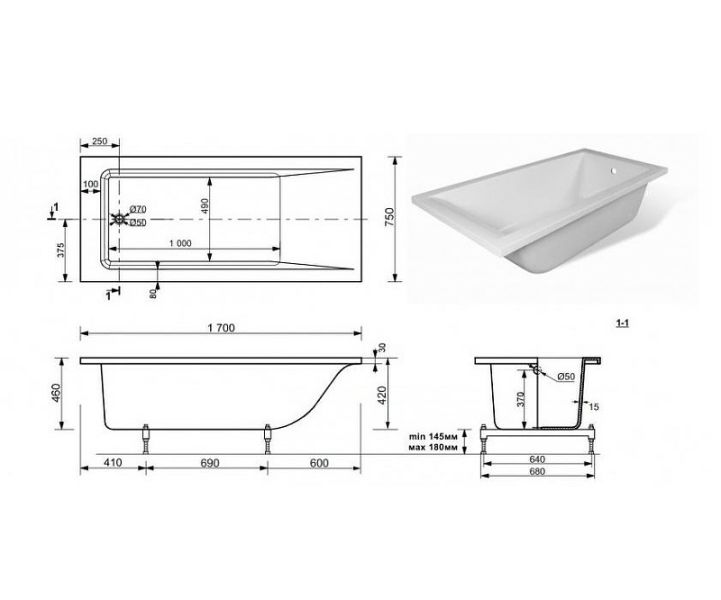 Ванна из литьевого мрамора Эстет Дельта 170В ФР-00001681 170x70см белый