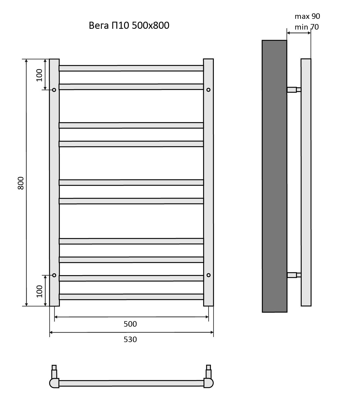 Полотенцесушитель водяной Aquatek (Акватек) Вега П10 500х800 мм, черный муар, подключение нижнее/диагональное, сверхпрочная пищевая нержавеющая сталь AISI 304L, гарантия 10 летХарактеристики:Стойка D-обр.,ребра Ф 18,без фитинговКомплектация:полотенцесушитель;