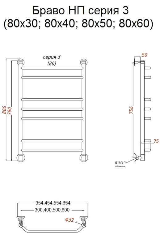 Водяной полотенцесушитель Тругор Браво НП 3 80x40см хром Браво3/нп8040