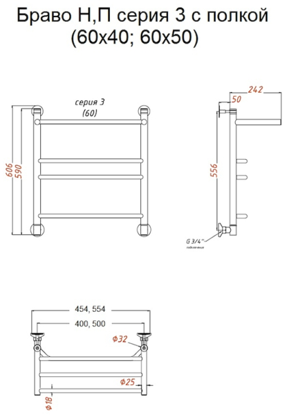 Водяной полотенцесушитель Тругор Браво НП 3 П с полкой 60x50см хром Браво3/нп6050П