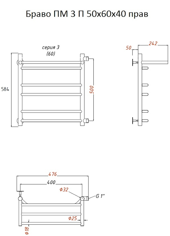 Водяной полотенцесушитель Тругор Браво ПМ 3 П 50x60x40см с полкой правый хром Браво3/ПМ506040Пправ