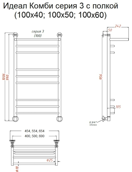 Водяной полотенцесушитель Тругор Идеал комби НП 3 П с полкой 100x50см хром Идеал/комби3/нп10050П