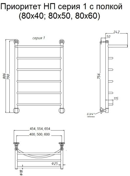 Водяной полотенцесушитель Тругор Приоритет НП 1 П с полкой 80x50см хром Приоритет1/нп8050П