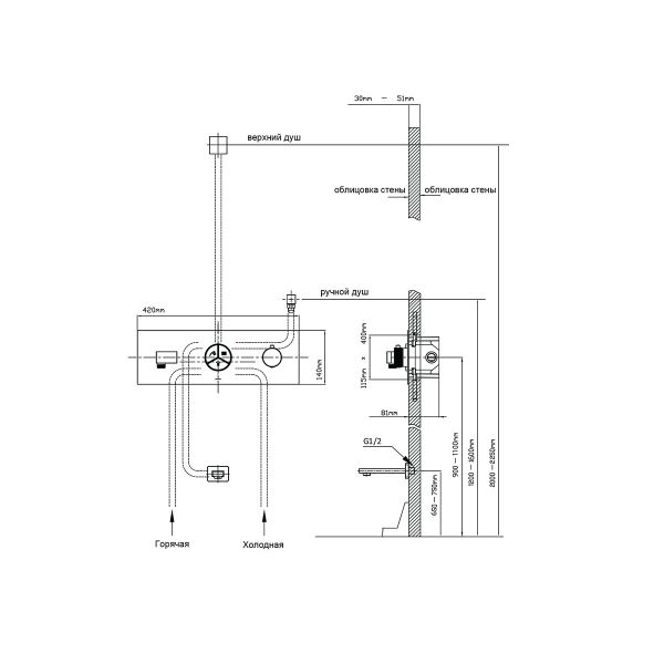 • Встроенный держатель для ручного душа с шланговым подключением.