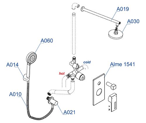 Керамический картридж 35мм, Sedal (Испания), Керамический поворотный переключатель, Лейка 3-функциональная с системой защиты от известковых отложений, Комплект скрытого монтажа, Наружная часть смесителя, Душевая насадка ? 250 мм, 135 форсунок, ABS-пластик . Смеситель для ванны и душа Alme 1541, Подключение шланга A021, Верхняя душевая насадка A030, Верхний излив для душа A019, Лейка 3-функциональная A060, Настенный держатель лейки, поворотный А014, Шланг для душа 1500 мм A010. латунь, хромоникелевое покрытие, ABS-пластик