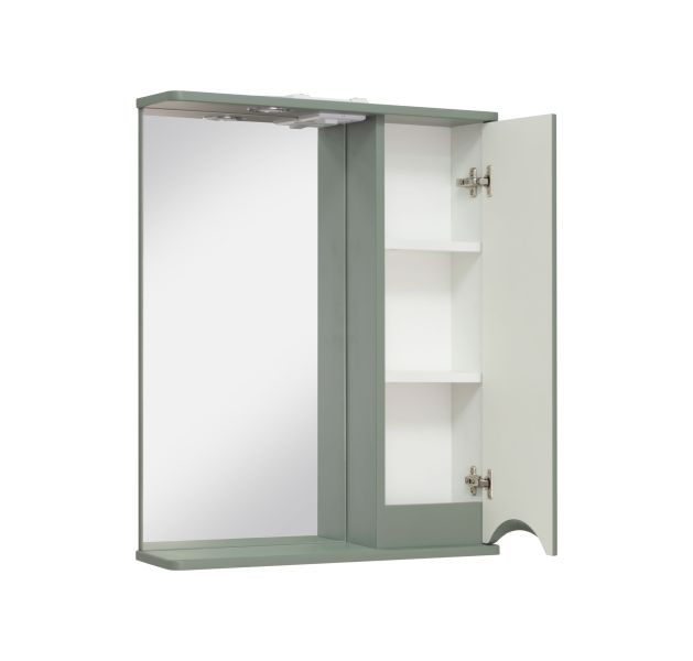 Зеркало настенное со шкафчиком и полкой RUNO АФИНА - покрытое эмалью зеркало, имеет презентабельный и красивый внешний вид, обладает повышенной влагостойкостью и долговечностью, характеризуется удобством и простотой в уходе. Зеркальный шкаф АФИНА - безупречное сочетание модных тенденций с классическим оформлением ванной комнаты. Зеркало для ванной комнаты со шкафчиком АФИНА, представляет собой зеркало настенное (слева) и шкаф в ванную с одной дверцей (справа). В шкафу имеются две внутренние полки. Шкаф для ванной комнаты оборудован одним врезным светодиодным светильником 220В и розеткой с выключателем, комплектуется петлями со встроенным доводчиком. Мебель для ванной RUNO - красота и практичность в мелочах!