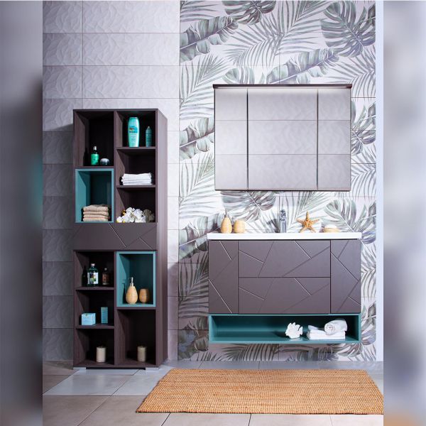 Внутреннее содержание шкафа умело организовано: разнообразные полки и отсеки позволяют удобно разместить все необходимые аксессуары – от косметики до бытовой химии. Зеркало, интегрированное в фасад, визуально расширяет пространство и облегчает утренние рутинные процедуры.