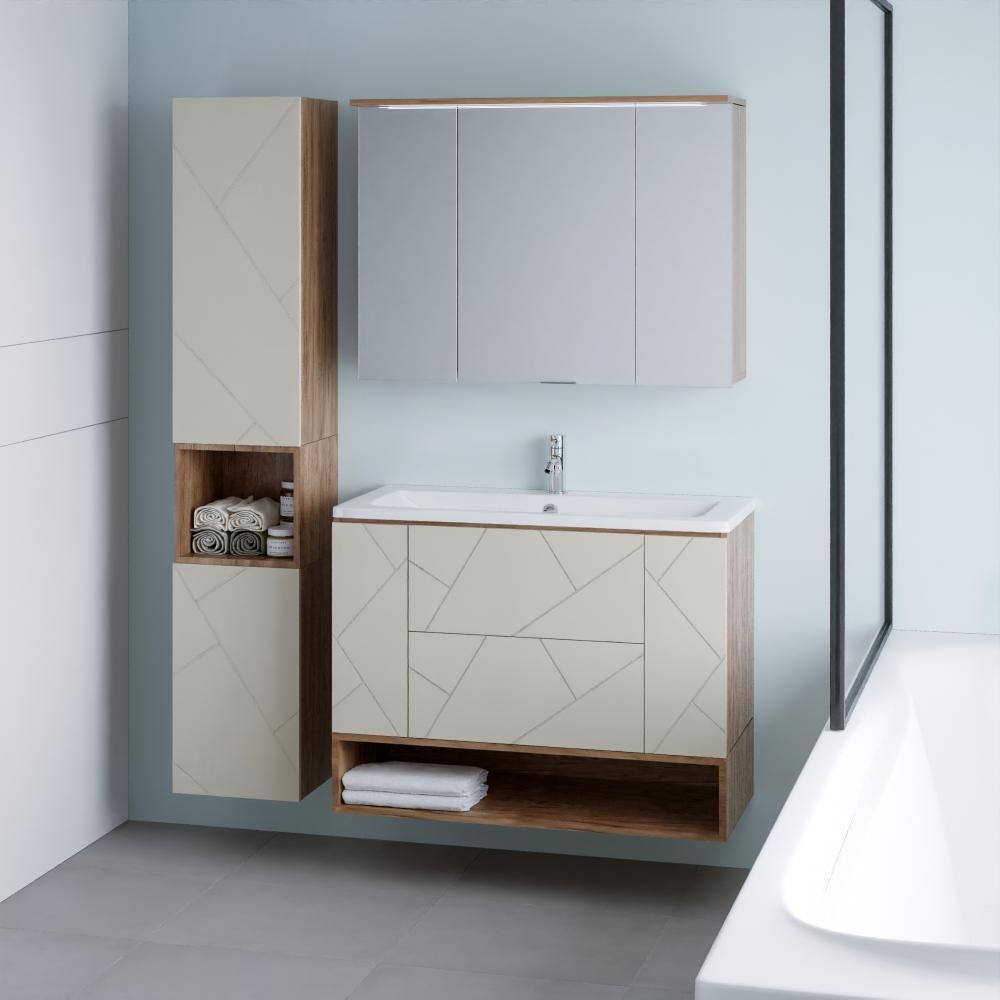 Внутреннее содержание шкафа умело организовано: разнообразные полки и отсеки позволяют удобно разместить все необходимые аксессуары – от косметики до бытовой химии. Зеркало, интегрированное в фасад, визуально расширяет пространство и облегчает утренние рутинные процедуры.