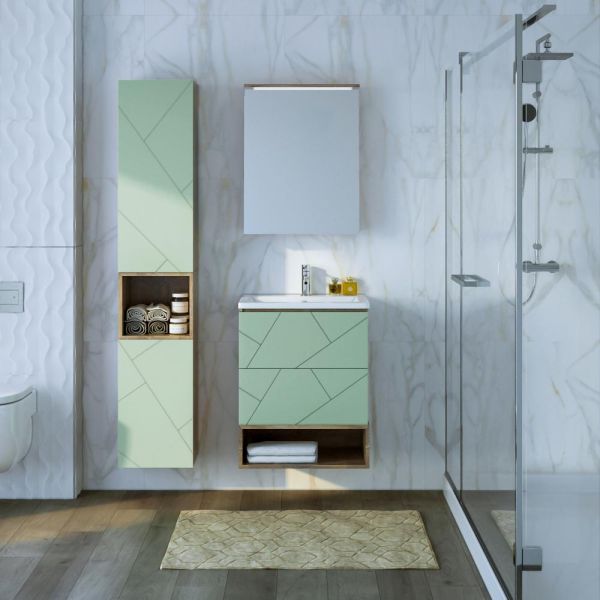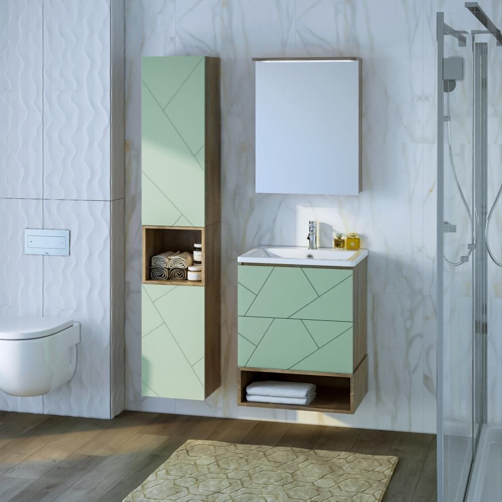 Внутреннее содержание шкафа умело организовано: разнообразные полки и отсеки позволяют удобно разместить все необходимые аксессуары – от косметики до бытовой химии. Зеркало, интегрированное в фасад, визуально расширяет пространство и облегчает утренние рутинные процедуры.