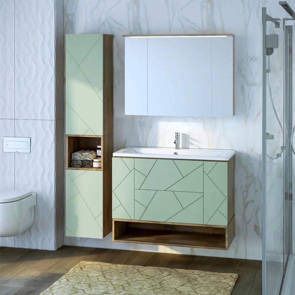 Внутреннее содержание шкафа умело организовано: разнообразные полки и отсеки позволяют удобно разместить все необходимые аксессуары – от косметики до бытовой химии. Зеркало, интегрированное в фасад, визуально расширяет пространство и облегчает утренние рутинные процедуры.