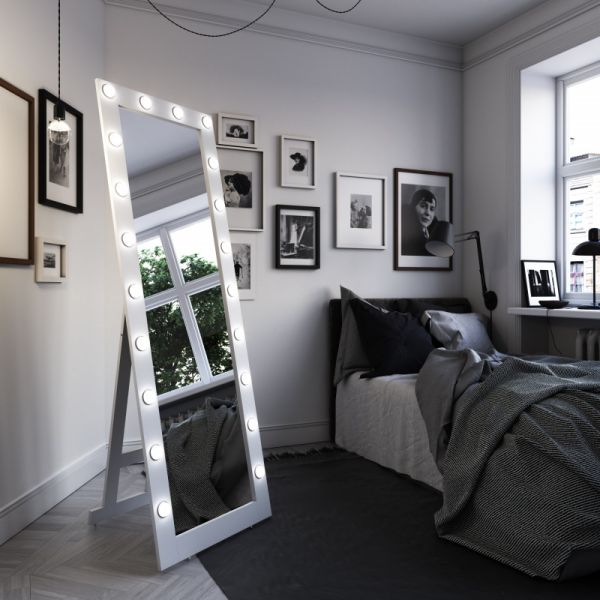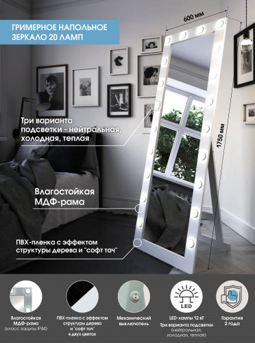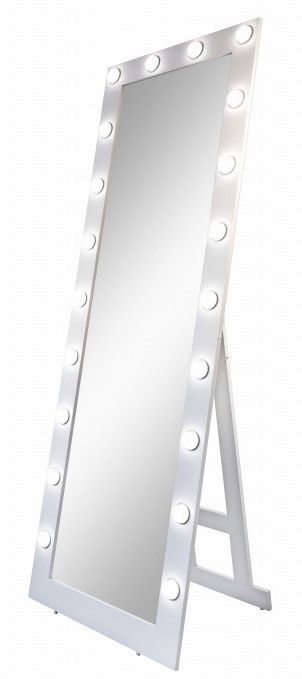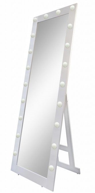 Зеркало Гримерное напольное белое 600х1750 (20 ламп)LED подсветка 6000Кмеханический выключательрама МДФ цвет рамы - белый