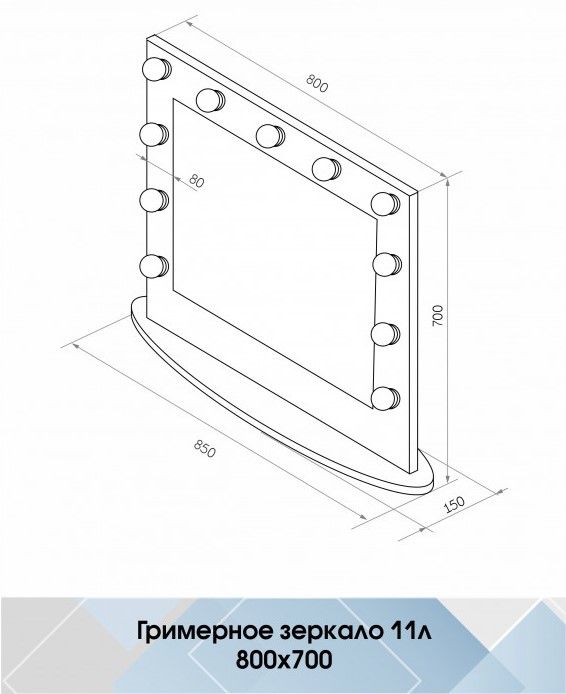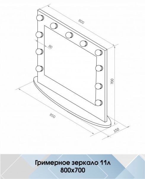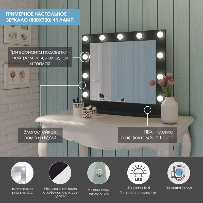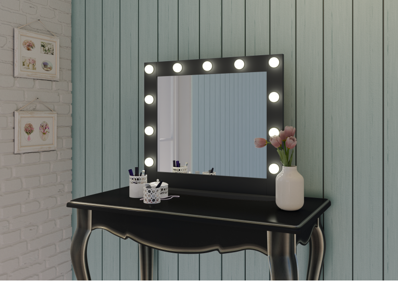 Зеркало Гримерное настольное черное 800х700 (11 ламп)LED подсветка 6000Кмеханический выключательрама МДФ цвет рамы - черный